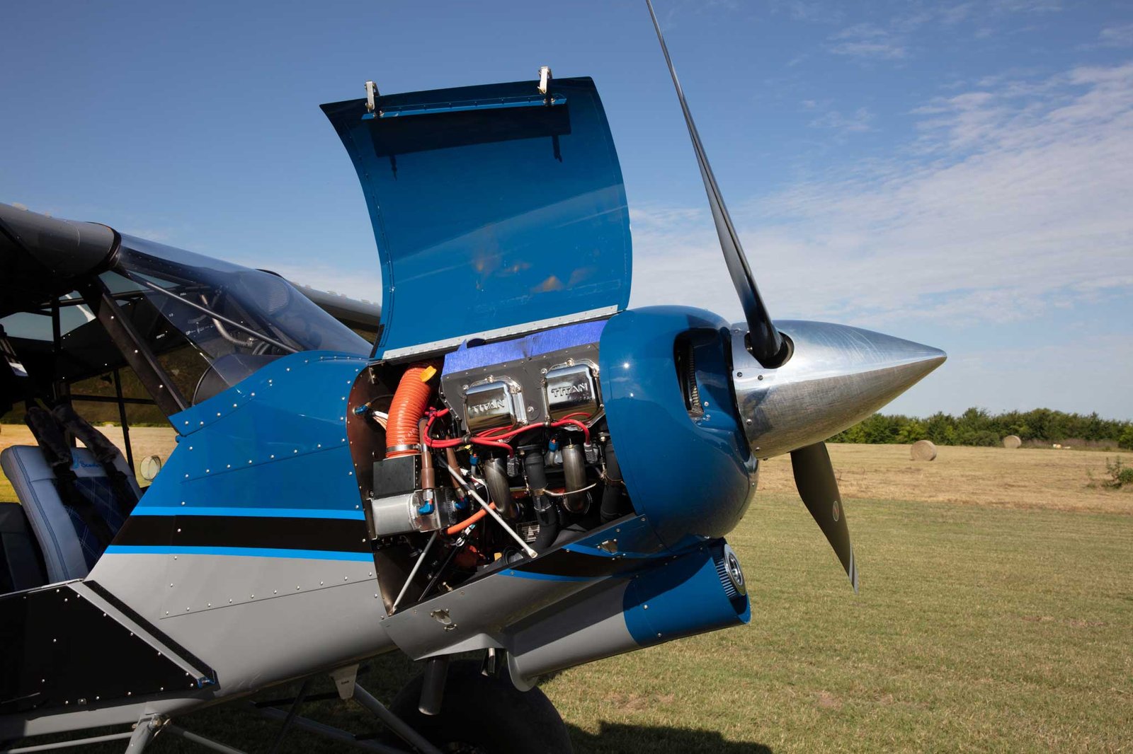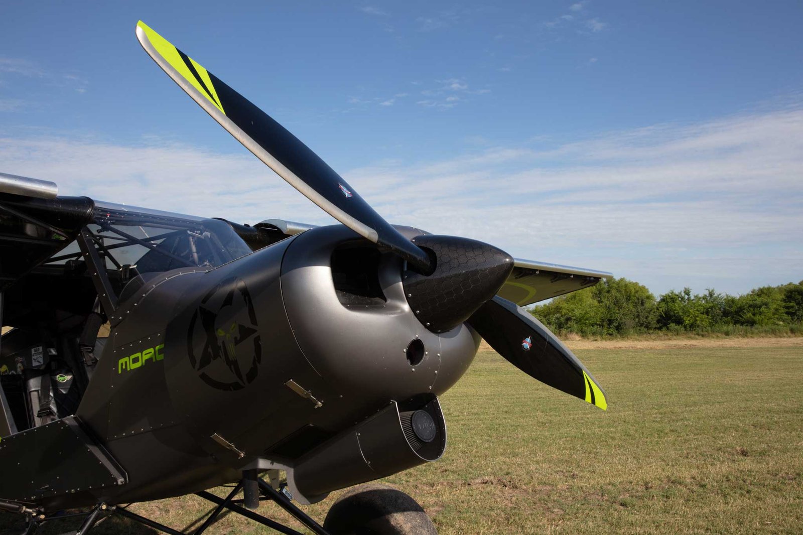 Horsepower first. The MOAC has more than double the horsepower of the standard Legend Cub thanks to a Titan engine from Continental. It produces maximum power of 208hp, with 187-195hp available continuous. Various propellers can be attached from a simple Cato fixed-pitch prop to a sophisticated Hartzell constant-speed.