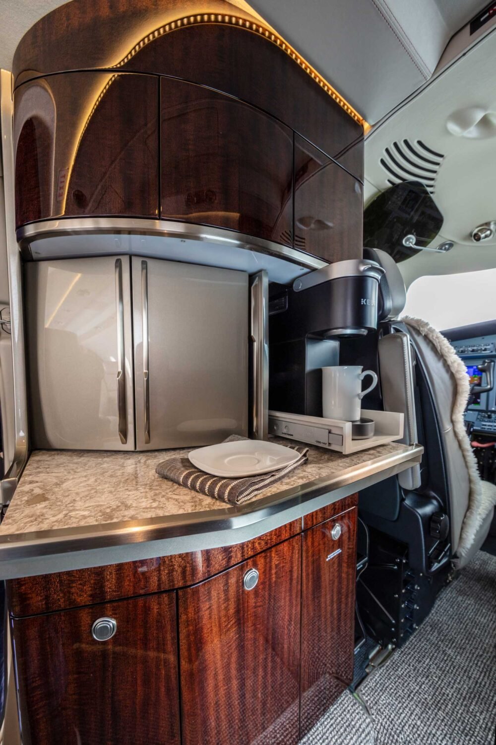 Upon entering the CJ4 Gen2, customers and pilots will notice redesigned stairs with a lower point of entry, handrail support and a customizable logo light. The refreshment centre and galley area are comprised of improved storage options and an optional high power outlet accompanied by a pull-out surface for a coffee maker. Additionally, extendable stone countertops are also available.