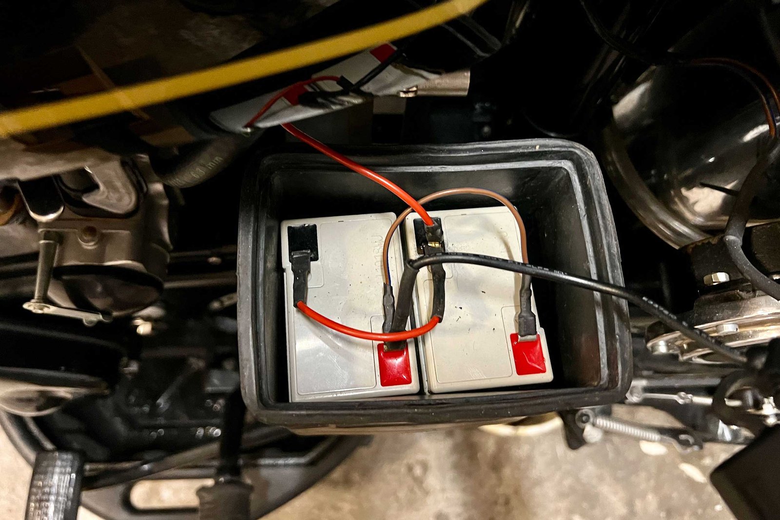 In the case of my 1963 Velocette Venom, it was a surprise to me when removing the battery and finding it was a fake exterior, which did look original and period, with two Lucas sealed lead acid rechargeable batteries inside, wired in parallel. Wiring in parallel retains the original voltage, in this case 6 volts, while doubling the ampere hour capacity.