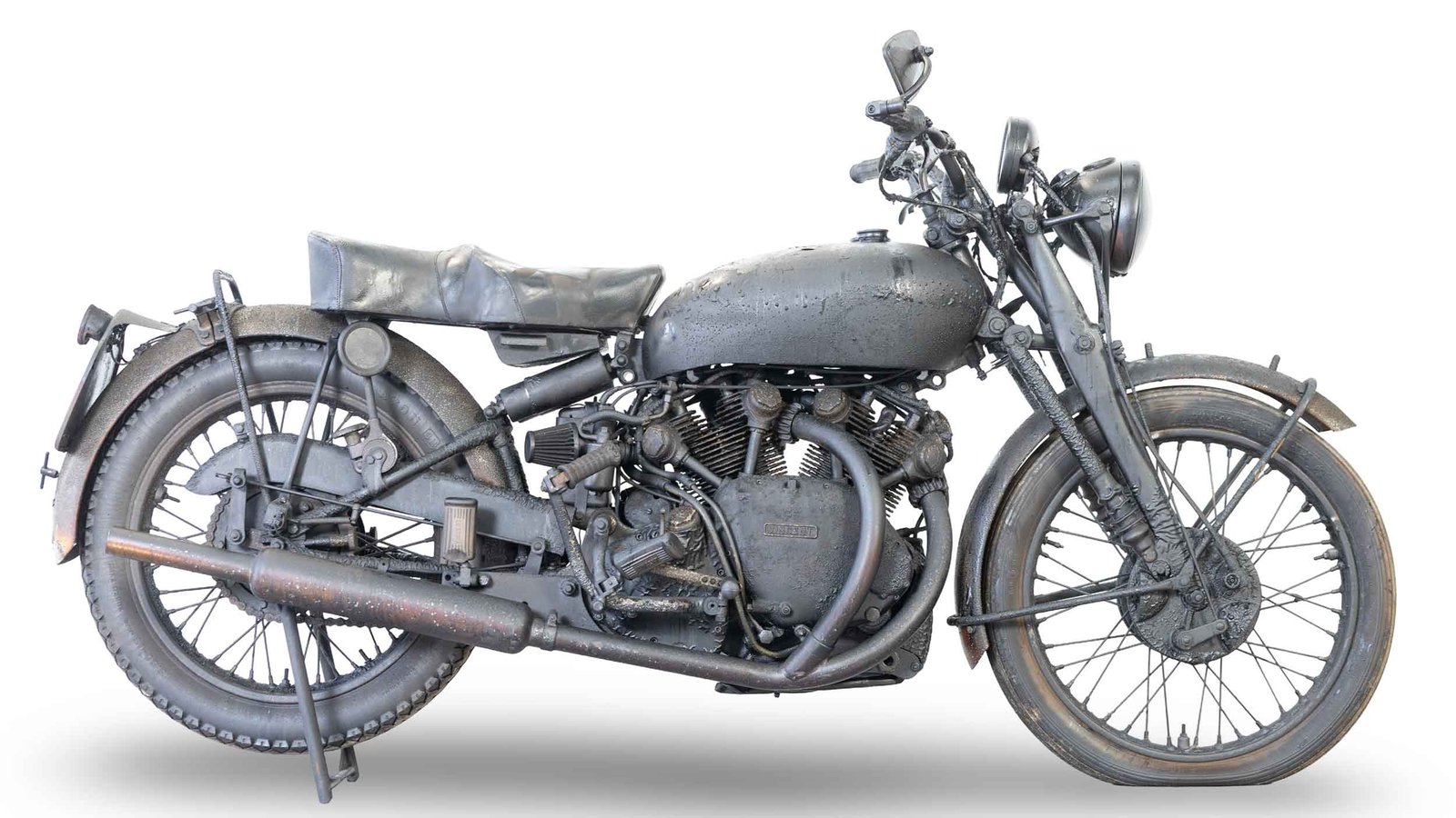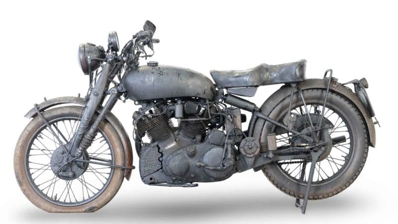 The motorcycle was hidden in a sealed container that later survived a fire. This 1954 Series-C 998cc Black Shadow comes to auction with its tyres still holding air, its big v-twin turning over with compression and its paintwork carrying the patina of an unexpected bonfire.