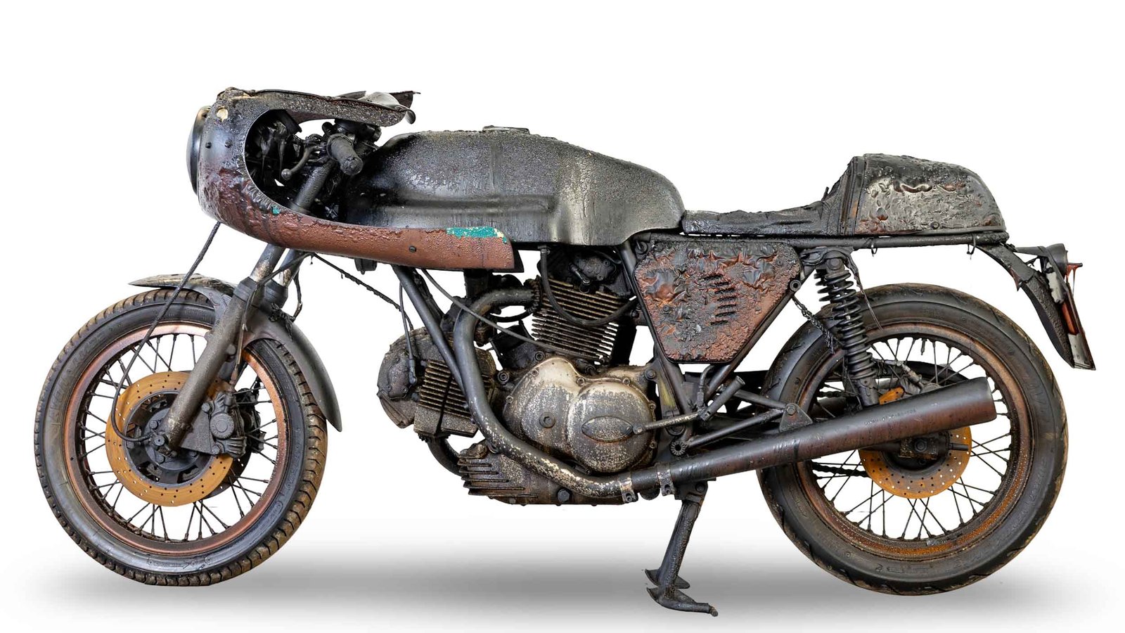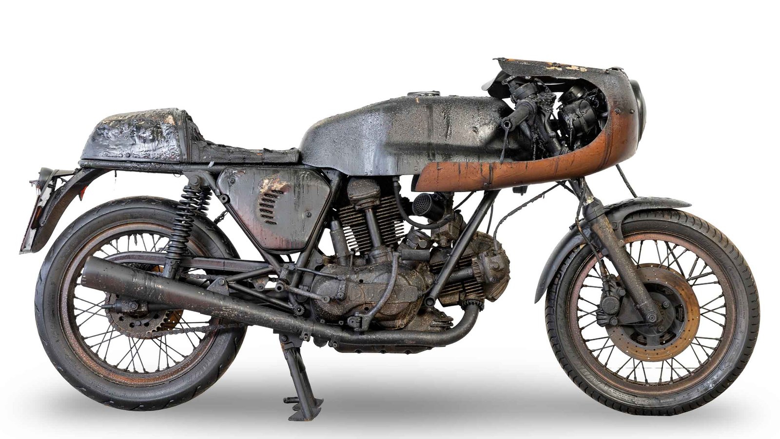 Stored in a sealed container that subsequently caught fire, the Ducati escaped the worst of the flames but was exposed to significant heat. When pulled out, the tyres still held air, the engine turned over with compression, and it reportedly smelled strongly of smoke. The auction house stresses that no guarantees are made about condition or structural integrity, and the bike is sold exactly as viewed.